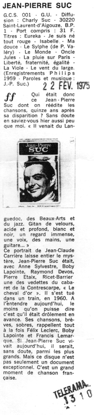 Chronique de Jacques Marquis sur le 30 cm "Jean-Pierre Suc chante"